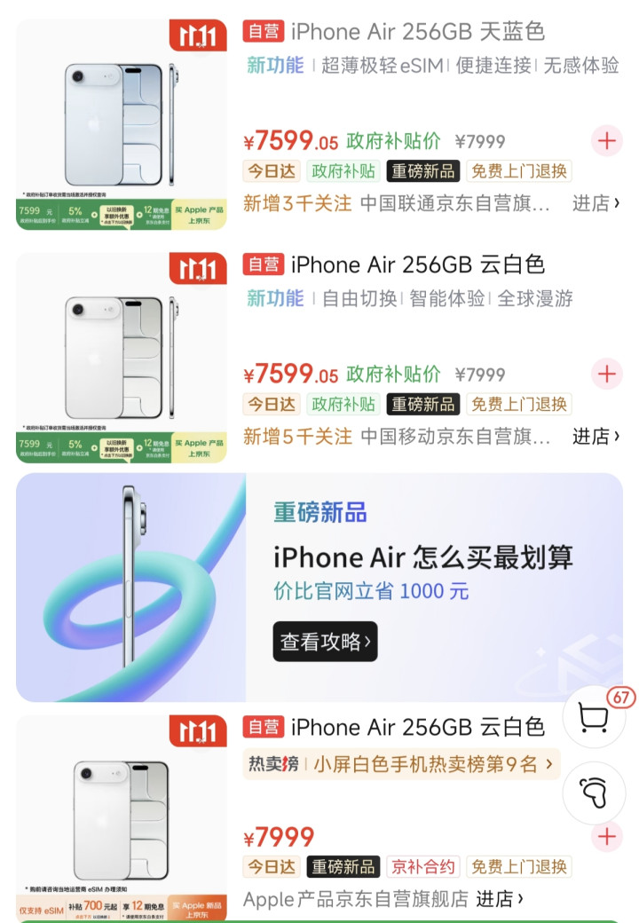 值得注意的是,目前仅三大运营商——电信、移动、联通的京东自营店支持“政府补贴”,且无地区限制。查询其他电商平台显示,iPhoneAir全系在拼多多补贴500元;而淘宝并无优惠。