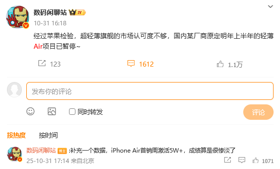科技博主@数码闲聊站日前也透露称,iPhoneAir国内首销周(10.22-10.29)激活量仅5万余台,“成绩算是很惨淡了”。其还表示,经过苹果检验,超轻薄旗舰的市场认可度不够,国内某厂商原定明年上半年的Air项目已暂停。